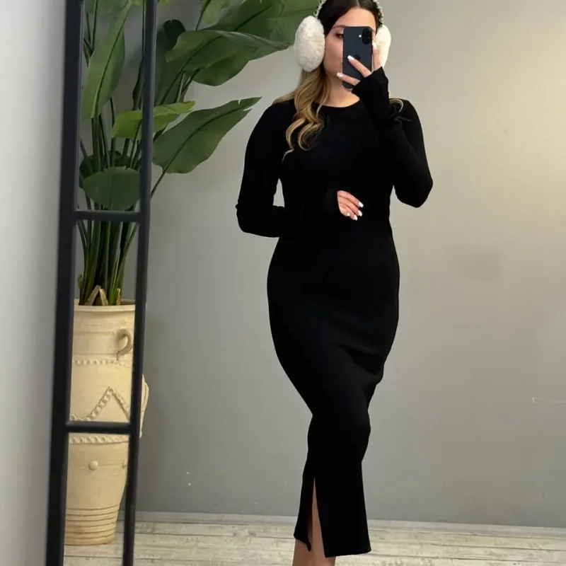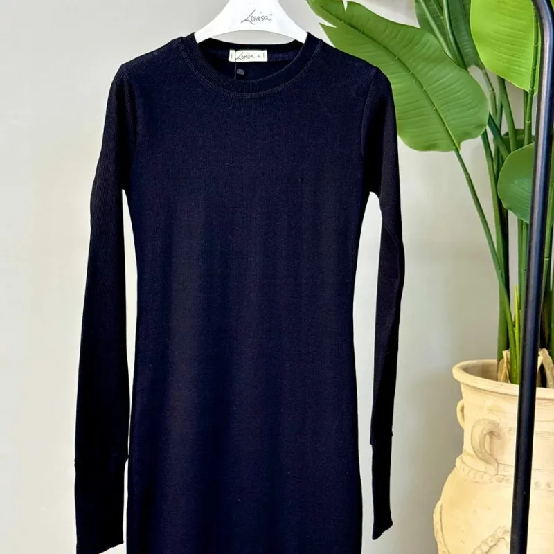 ✨ سارافون یقه گرد آستین انگشتی مشکی با طراحی ساده و شیک، مناسب برای استایلهای مینیمال و روزمره.