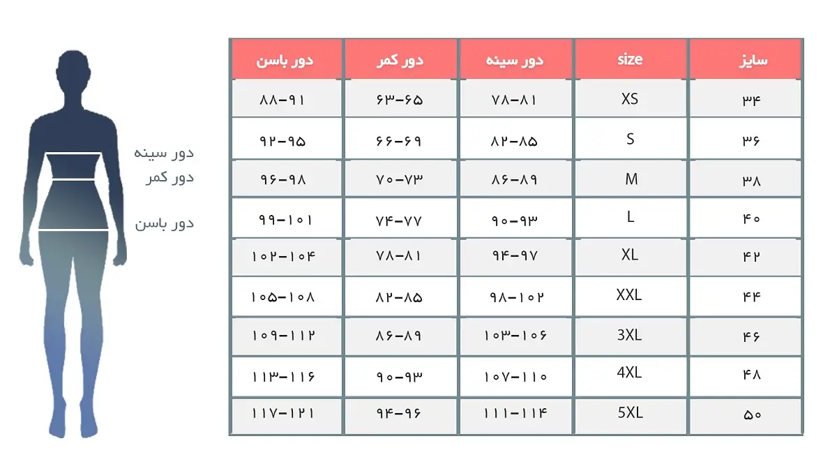 ℹ️ توجه داشته باشید اندازهگیریها بهصورت دستی انجام میشود و امکان خطای تا ۵ سانتیمتر در عرف پوشاک طبیعی است.